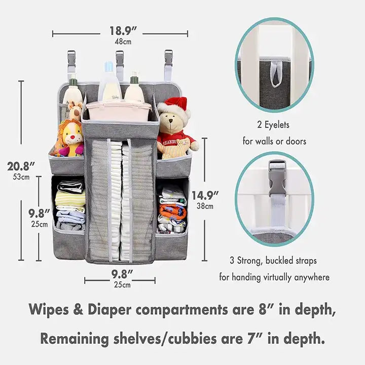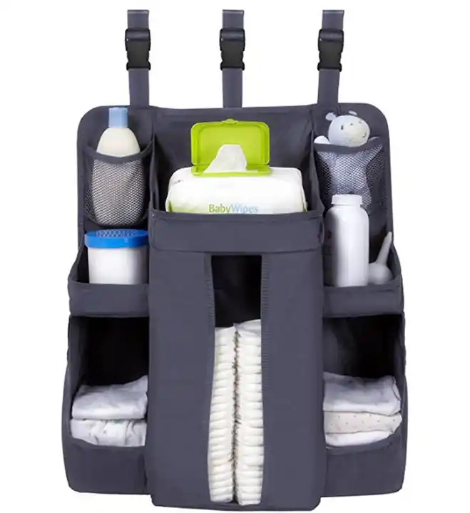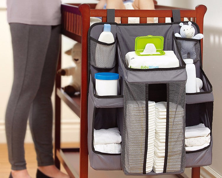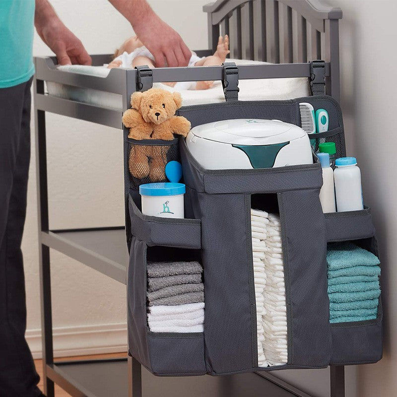 Su diseño multifuncional y portátil permite colgarlo fácilmente en la cuna, el coche, la pared o el cambiador, manteniendo todo al alcance de tu mano.
