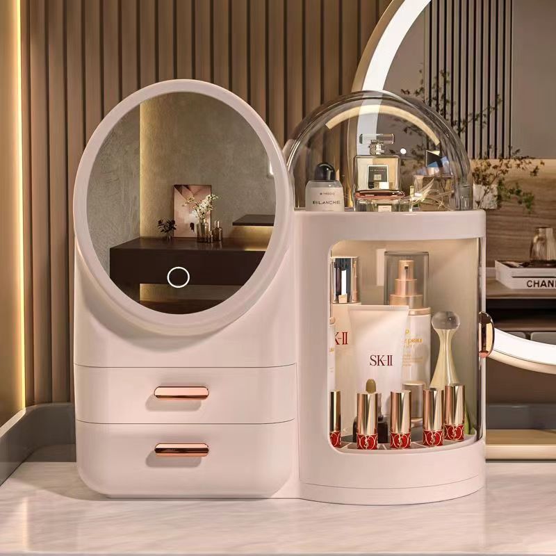 Transforma tu rutina de belleza con esta caja de almacenamiento de cosméticos con espejo de luz LED integrada, perfecta para mantener tus productos ordenados y a la mano 💅🧴. Su diseño de tocador de lujo combina estilo moderno y funcionalidad, ideal para escritorios, baños o habitaciones 🌿🪄.