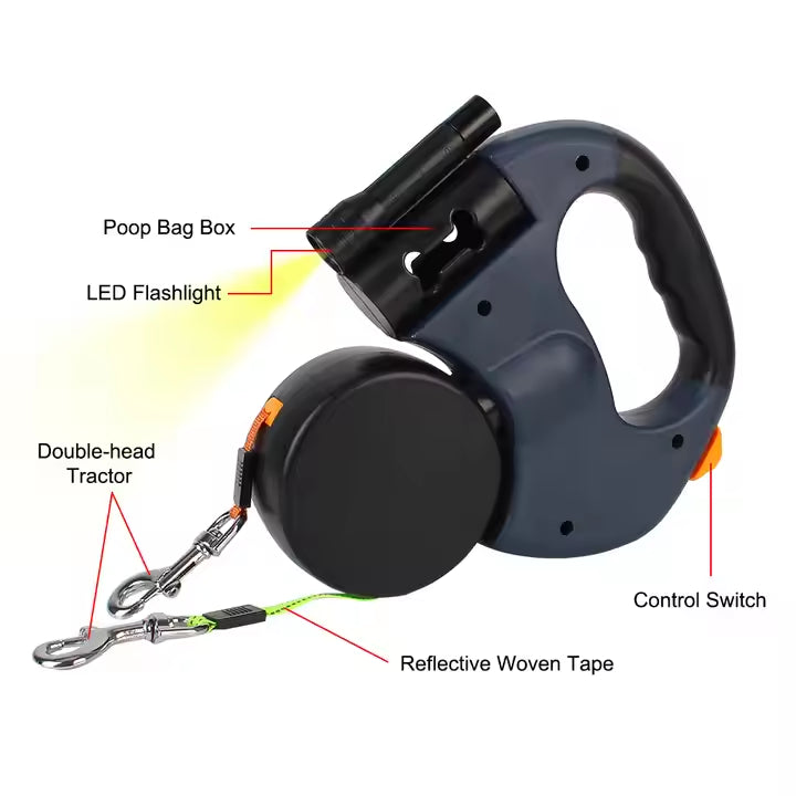 Con esta 🐕 correa 2 en 1 retráctil con linterna y bolsa integrada cada paseo será más cómodo y seguro 🌟. Su sistema de doble correa giratoria 360° 🔄 evita enredos, permitiéndote caminar con dos perros a la vez 🐶🐶 sin complicaciones. La linterna LED integrada con 3 modos de luz 💡 ilumina el camino, brindando tranquilidad en paseos nocturnos 🌙 o en lugares poco iluminados. Además, el dispensador de bolsas 🛍️ te da la practicidad de mantener todo limpio sin cargar accesorios extra.