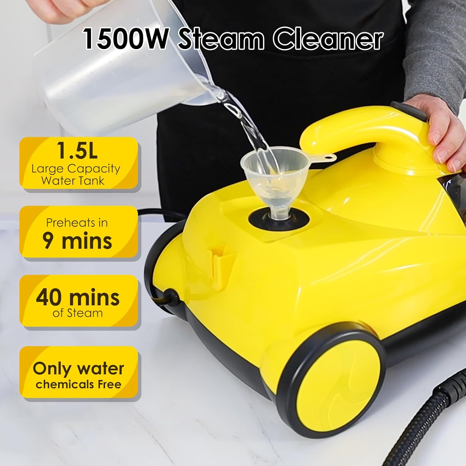 Descubre el poder del Limpiador de Vapor Profundo de 1500W, una herramienta versátil y eficaz que deja tus superficies impecables sin necesidad de productos químicos agresivos. Con su diseño portátil y múltiples accesorios, es ideal para limpiar desde tapicería hasta azulejos, alfombras y más.