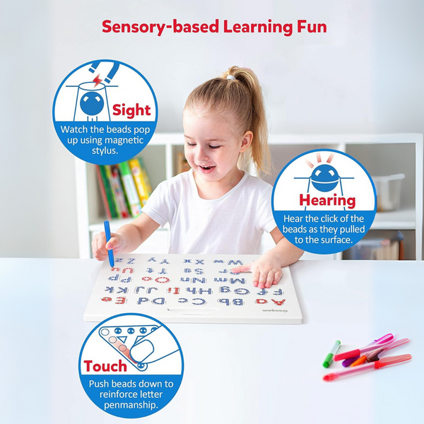 ¿Quieres que tus niños aprendan jugando? 🎉 Este tablero es la herramienta ideal para que practiquen ✍️ escritura y 🤲 motricidad fina de forma divertida y educativa. Gracias a su superficie magnética 🧲, las bolitas metálicas suben al trazar cada letra o número con el lápiz imantado 🖊️, guiando a los pequeños en el aprendizaje correcto.