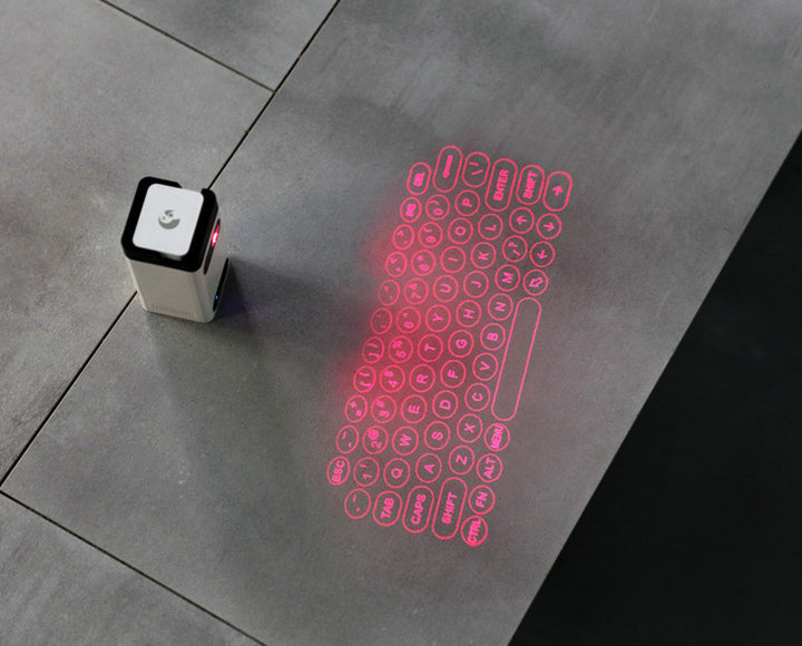 Con solo colocar el dispositivo sobre una mesa, proyecta un teclado virtual rojo brillante que responde a cada toque con precisión. No hay teclas físicas, pero sí una respuesta rápida y fluida que imita la escritura real. ¡Es como tener un teclado completo en tu bolsillo! 🔴⌨️