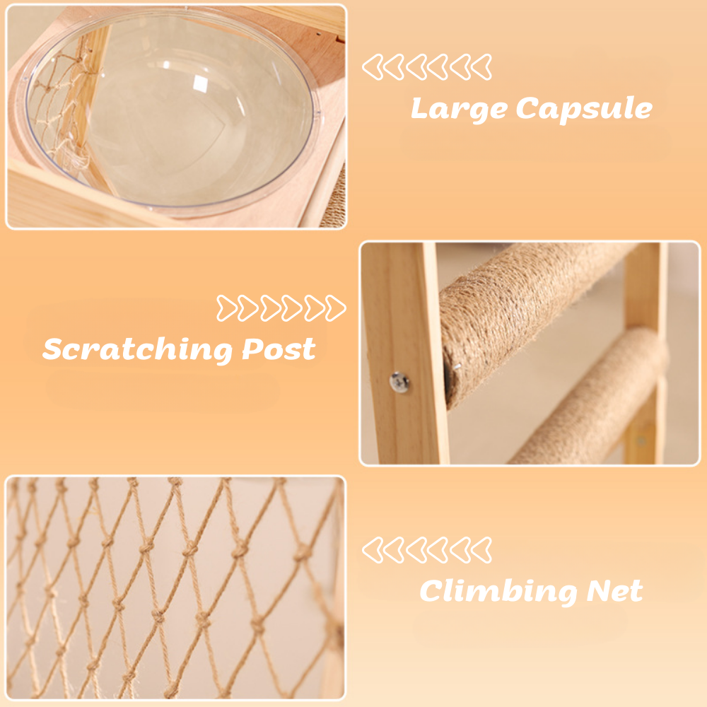 Cuenta con plataformas amplias, una hamaca cómoda, y una cápsula espacial acrílica transparente 🚀👁️ que permite a tu gato observar su entorno desde las alturas, estimulando su curiosidad natural 🧠🐾.