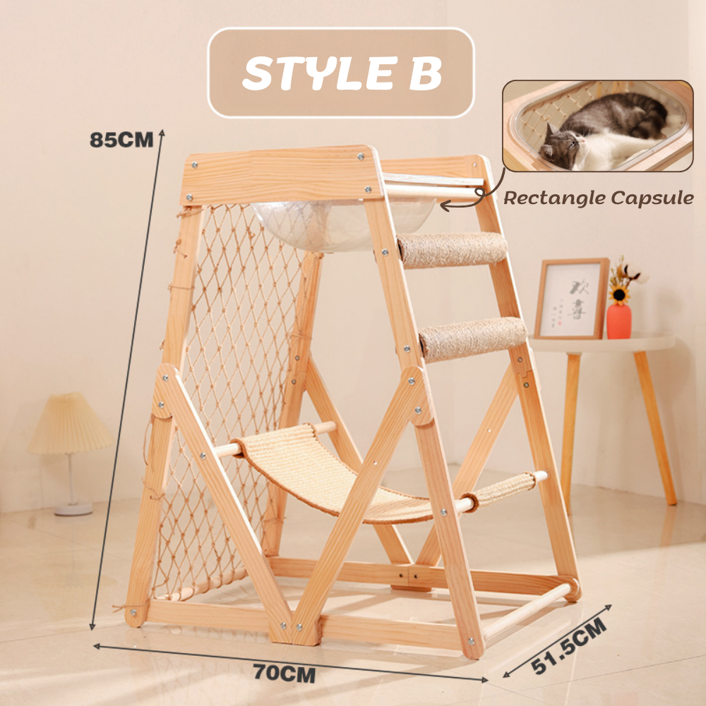 Incluye plataformas amplias, hamaca, cápsula elevada y postes de rascado
