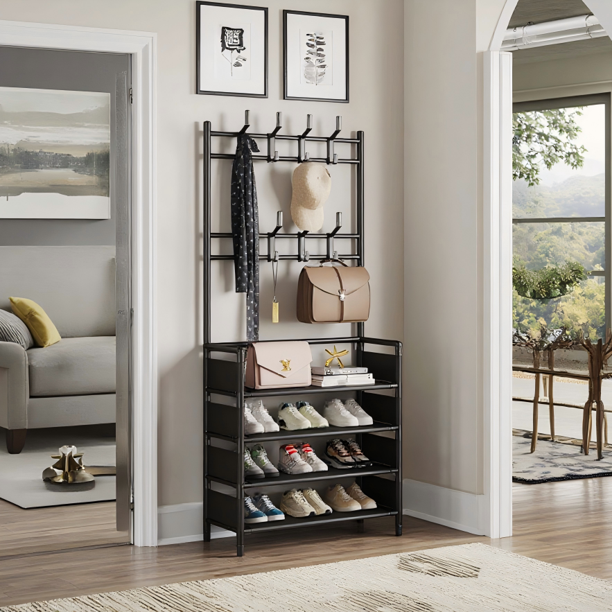 Incluye ganchos laterales multiusos que puedes usar para colgar bolsos, sombreros, paraguas o accesorios 👜🎩, convirtiéndolo en un organizador versátil para tu hogar. Además, su fácil montaje lo hace ideal para quienes buscan orden sin complicaciones.
